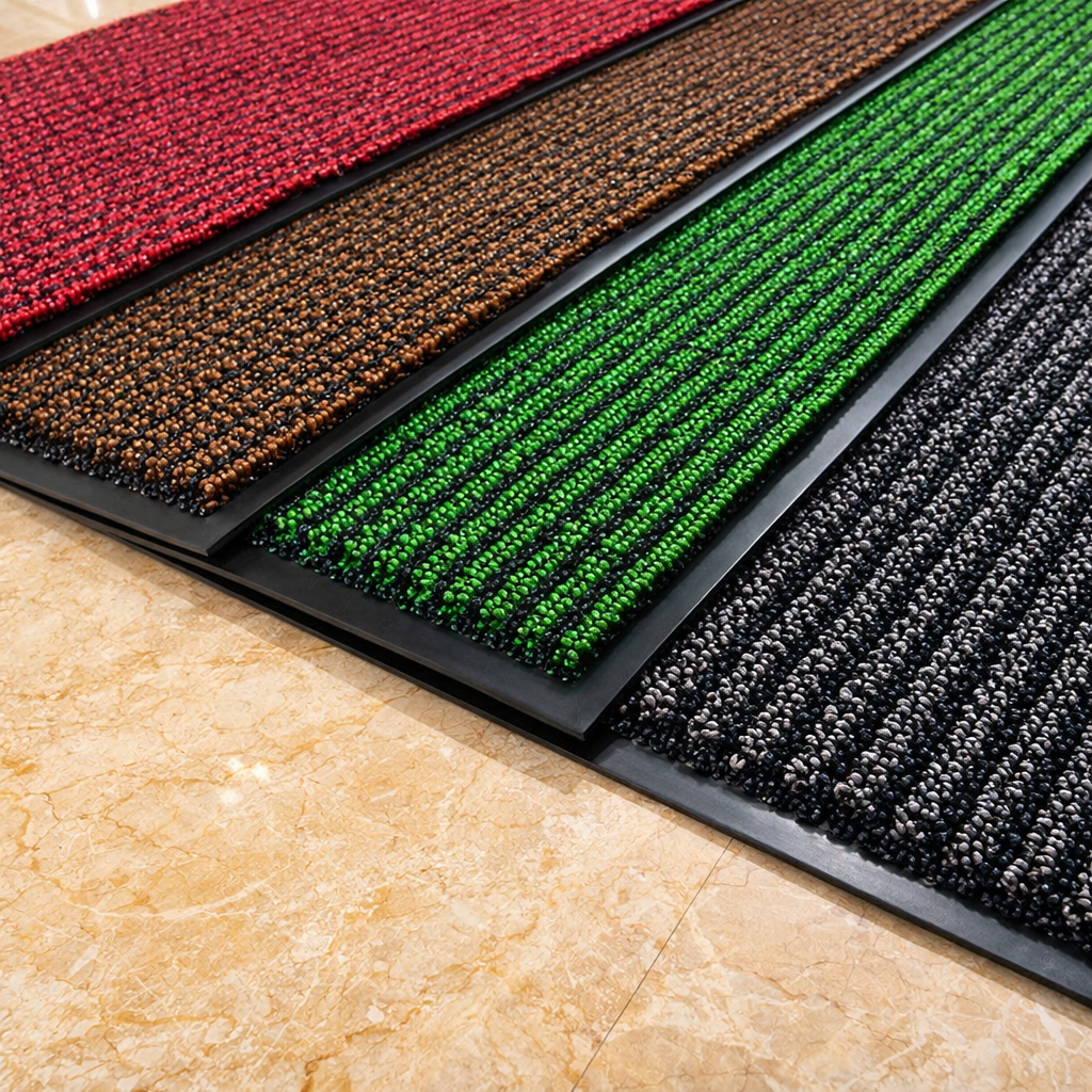 Polypropylene looped pile dual stiffness fiber commercial matting in ribbed pattern with tough vinyl backing and all-around compressed borders